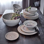 Die grafischen und organischen Formen von Kristallglas inspirierten den Designer bei der Gestaltung dieses wunderschönen, edel anmutenden Tafelgeschirrs. Ein angenehmer Grauton vermittelt sympathische Eleganz. Jede Tellerform hat ein unterschiedliches Design, dennoch harmoniert alles perfekt und bringt so lebendige Abwechslung auf den Tisch. Hochwertig glasiertes, äußerst robustes und widerstandsfähiges Craquelé-Geschirr, bei 1.180 °C gebrannt, von Hand gebürstet und geputzt.